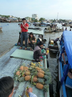 L’excursion s’est terminée par un tour dans un marché public de Cần Thơ. Un marché typique de cette région du monde, avec toutes les odeurs, tous les bruits et toutes les scènes propres à un tel lieu. Nous sommes ensuite rentrés à l’hôtel, nous avons avalé un repas en vitesse, avant de prendre un bus pour Ho-Chi-Minh-Ville, où de nouvelles aventures nous attendaient.