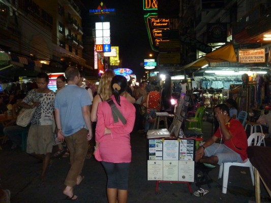 J’y ai vu: des gens trop saouls pour marcher; des femmes en train de se battre; des danseurs de breakdance talentueux; des cantines mobiles desquelles se dégagent toutes sortes d’odeurs; des vendeurs de diplômes et de permis en tous genres; des quidams qui peuvent débloquer votre cellulaire à toute heure du jour ou de la nuit; des bars extérieurs, installés sur le trottoir, qui vendent des bières à des prix dérisoires (pour le quartier) et qui font jouer de la musique à des volumes assourdissants; des gens qui hurlent, parfois sans raison apparente; des touristes avec sac à dos qui débarquent sans cesse, même jusque tard dans la nuit; des studios de tatouage ouverts 24 heures sur 24 (mais qui se fait tatouer à 4 h 37?); des 7/11 partout, mais vraiment partout; des employé-es de d’un bar portant des t-shirts sur lesquels étaient inscrits “we don’t check ID”; des tailleurs aux offres toujours alléchantes (selon eux); des tuks-tuks et leurs chauffeurs parfois insistants, parfois impertinents; des vendeurs d’articles contrefaits; et bien d’autres.