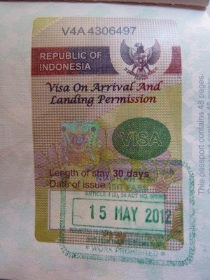 Vol sans histoire, encore une fois. Environ 2 h 30 après le décollage, je suis arrivé à l’aéroport international de Denpasar Ngurah Rai, en début de soirée. Je n’avais pas entrepris de démarches pour obtenir le visa indonésien, car j’avais lu qu’il était disponible à l’arrivée (d’ailleurs, voici la liste des points d’entrées – aéroports et ports – où il est possible d’obtenir le visa à l’arrivée, de même que la liste des pays dont les citoyens peuvent demander ledit visa). Or dans l’entrée même du terminal des arrivées internationales se trouvent les comptoirs où se procurer le visa. Il m’a coûté 25 $ US (en argent comptant) et il est valide pour 30 jours. Une fois payé, le visa doit être validé à un des guichets de l’immigration, juste à côté des comptoirs où l’on achète le visa. À noter qu’on ne m’a pas demandé de fournir une preuve que j’avais un billet d’avion pour quitter le pays, contrairement à ce qu’affirme le site du Ministère des affaires étrangères de la République d’Indonésie. En outre, votre passeport doit être encore valide au moins six mois après la date d’entrée dans le pays.