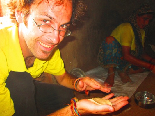 Au retour, le repas: une salade d’aubergine et des chapatis (pains traditionnels indiens, élaborés sans levain). On a préparé les légumes, puis la pâte pour les chapatis et finalement, les chapatis eux-mêmes. La tante de Ragu surveillait chaque étape: or mes premiers chapatis n’étaient pas conformes aux attentes, alors j’ai dû modifier ma technique de façonnage.