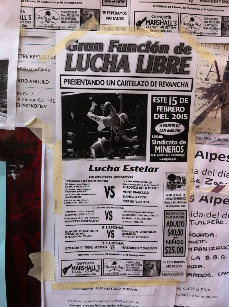 Mon deuxième gala fut une surprise. Je me promenais dans les rues de Guanajuato, tout ingénu, quand j’ai aperçu une affiche annonçant un gala de lucha libre pour le 15 février. Une date qui me convenait. Le prix du billet? Seulement 40 pesos (environ 3,17 $ CAN). Comme si j’avais besoin d’une raison supplémentaire pour me convaincre…
