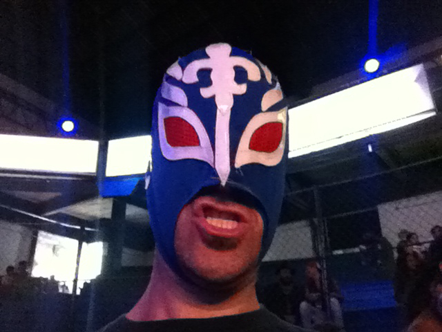 Pour mon premier gala, j’ai choisi de participer à une excursion offerte à mon auberge (Hostel Hospedarte): j’ai donc payé 220 pesos (environ 18,53 $ CAN) pour la soirée. Le prix incluait le billet d’entrée, le transport dans un bus-bar, un shooter et le transport dans une soirée post-gala au bar La Factoria. Le gala de 6 combats se déroulait à l’Arena Coliseo et il était présenté par le Consejo Mundial de Lucha Libre (CMLL). L’évènement débutait à 20 h 45, mais le bus est parti de l’auberge vers 21 h. Bleh. J’avais enfilé mon propre masque de luchador pour l’occasion, comme de nombreux autres amateurs. La foule était en délire. Et moi aussi.