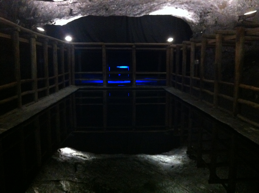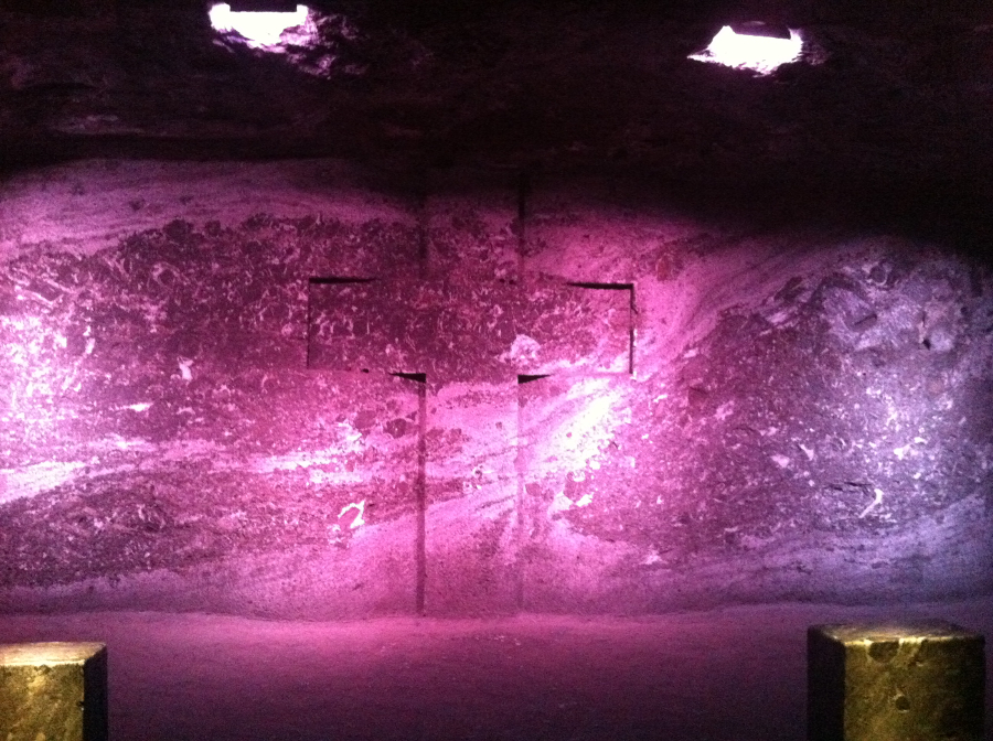 La cathédrale actuelle a été inaugurée en décembre 1995 et elle se trouve à 180 mètres sous terre. Air frais. Du sel sur les murs. Des croix taillées à même le roc, illuminées par des faisceaux colorées. Un dôme. Des escaliers qui mènent dans les entrailles de la mine. Des lumières pour éclairer les sentiers. Une ambiance particulière.