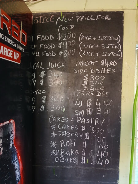 Le menu du KisKar Veggie Hut (en dollars guyaniens, bien sûr)